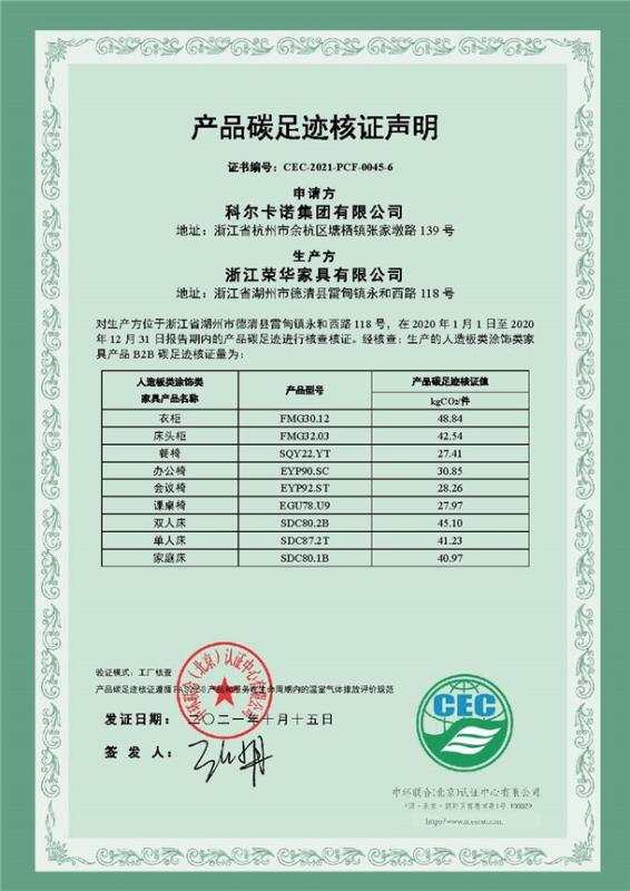 下一篇:浙江榮華家具有限公司碳足跡核證聲明-CEC-2021-PCF-0045-5-人造板類涂飾類家具