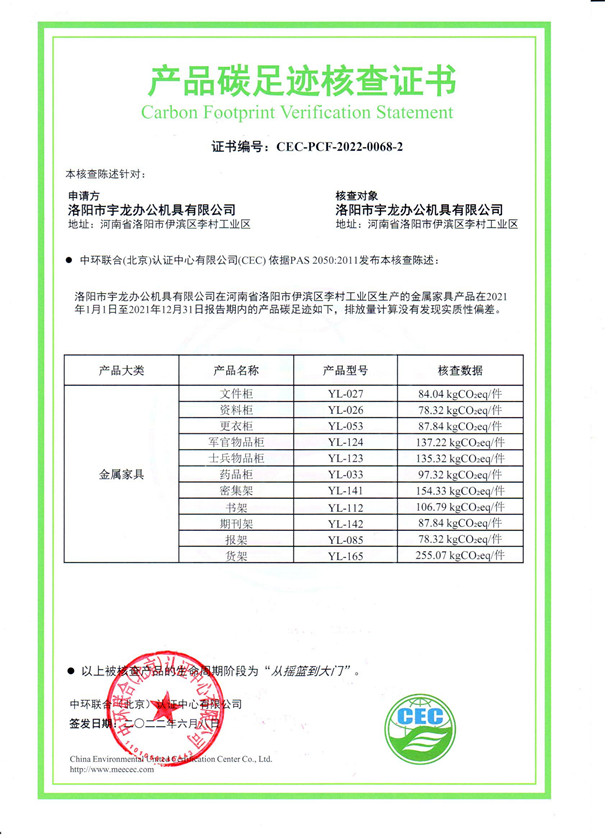 下一篇:洛陽市宇龍辦公機(jī)具有限公司-CEC-PCF-2022-0068-1-鋼木類家具