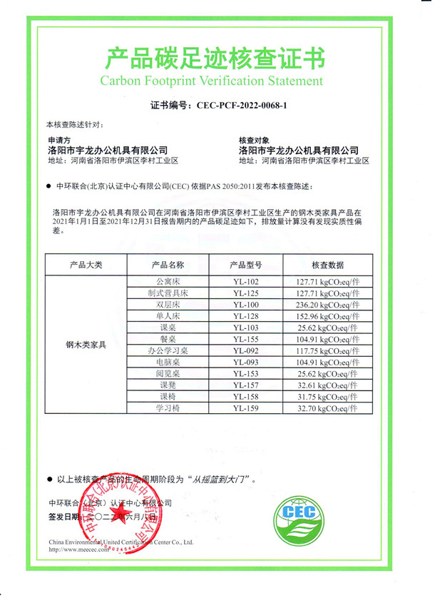 上一篇:洛陽市宇龍辦公機具有限公司-CEC-PCF-2022-0068-2-金屬家具