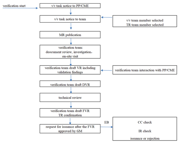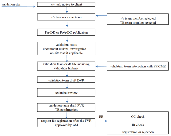 首先與項目參與方簽訂項目審定合同,在項目參與方遞交相關文件(包括PDD)之后,CEC正式開始審定工作。審定過程,CEC需要完成的工作有:對PDD進行公示、文件審查、現場評審、完成初始審定報告、完成最終審定報告并提交給CDM執行理事會(CDM-EB)。EB在收到最終審定報告后,將公示報告,公示期結束后,如無其他問題,對項目進行正式注冊。