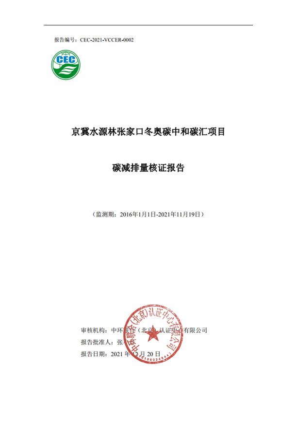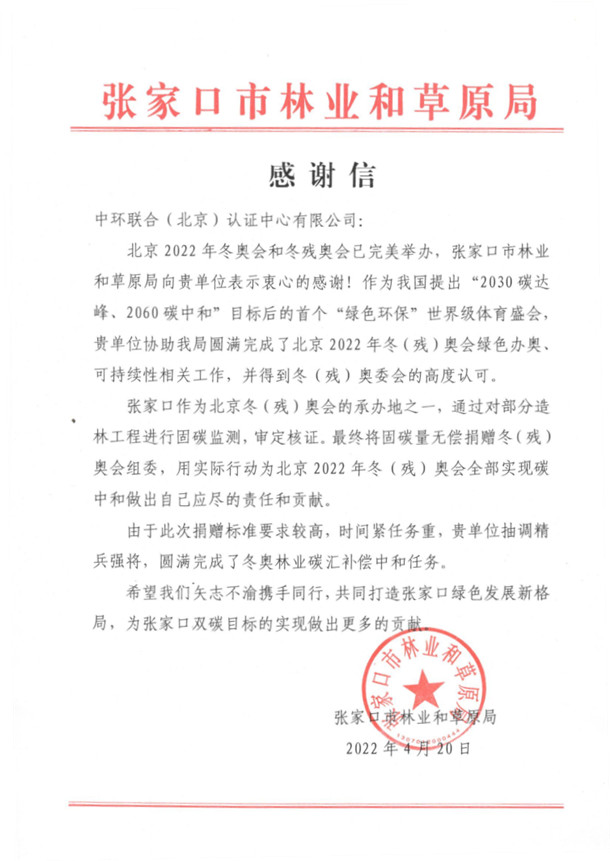 中環(huán)聯(lián)合(北京)認證中心有限公司(以下簡稱中環(huán)聯(lián)合)作為張家口市冬奧林審定核證機構(gòu),在此次捐贈標準要求較高、時間緊任務重的情況下,對“京冀水源林張家口冬奧碳中和碳匯項目”監(jiān)測期所產(chǎn)生的的林業(yè)碳匯量進行了審核,并編制提交了《京冀水源林張家口冬奧碳中和碳匯項目碳減排量核證報告》,協(xié)助張家口市圓滿完成了冬奧林業(yè)碳匯補償中和任務。近日也收到了來自張家口市林業(yè)和草原局的感謝信。