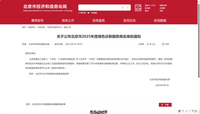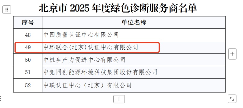 近日,北京市經濟和信息化局公布北京市2025年度綠色診斷服務商名單,中環聯合認證中心(以下簡稱“中環聯合”)憑借在綠色低碳領域的技術能力成功入圍。標志著在推動綠色轉型、服務國家“雙碳”戰略中的專業能力再獲權威認可。