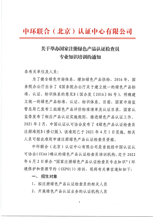 6月2日國家注冊綠色產(chǎn)品檢查員專業(yè)知識培訓(xùn)通知