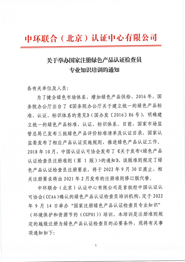 9月14日國家注冊綠色產(chǎn)品檢查員專業(yè)知識培訓通知