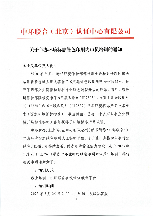 關(guān)于舉辦環(huán)境標(biāo)志綠色印刷內(nèi)審員培訓(xùn)的通知