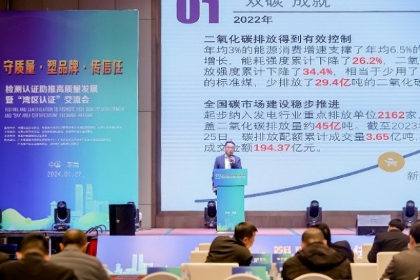 1月22日,“守質(zhì)量·塑品牌·傳信任”檢測(cè)認(rèn)證助推高質(zhì)量發(fā)展暨“灣區(qū)認(rèn)證”交流會(huì)在東莞舉辦。中環(huán)聯(lián)合(北京)認(rèn)證中心有限公司(以下簡(jiǎn)稱“中環(huán)聯(lián)合”)受邀參加,陳軼群副總經(jīng)理在會(huì)上做了“構(gòu)建雙碳認(rèn)證制度,強(qiáng)化雙碳質(zhì)量基礎(chǔ)設(shè)施建設(shè)”的主旨演講。